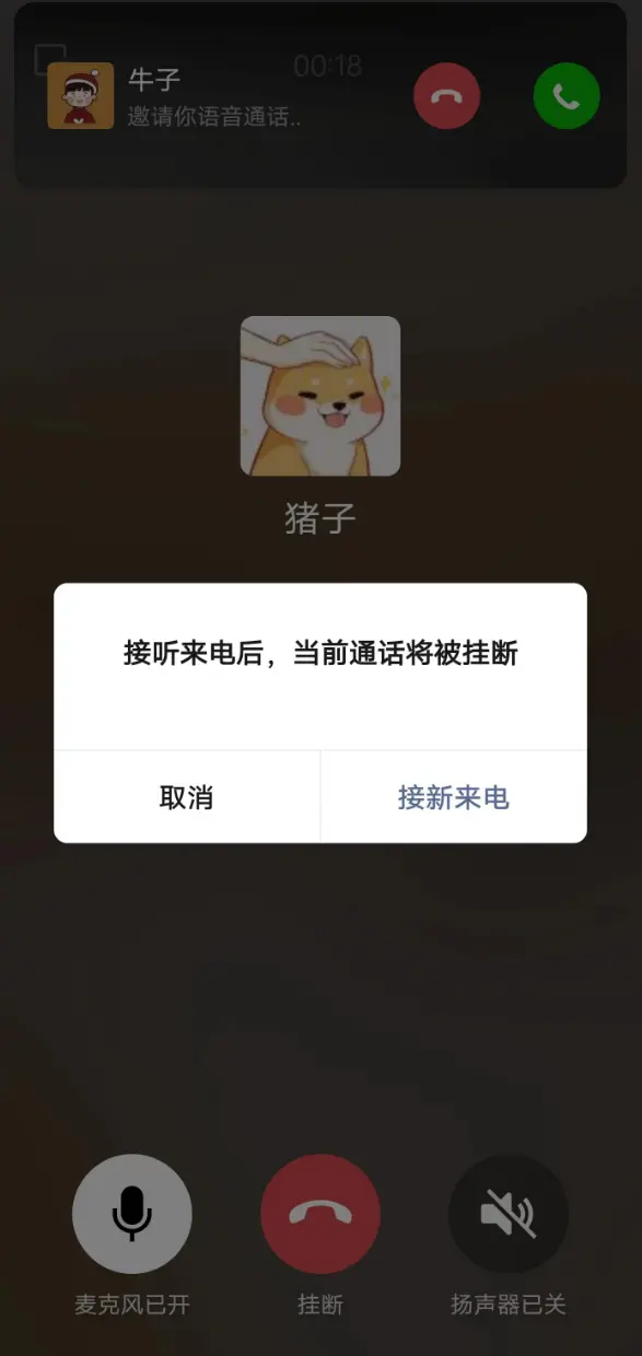 通话过程中如有第三方好友拨打电话,屏幕顶部弹出卡片通知你,是选择接听还是挂断。