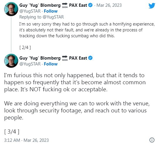 游戏业内人士Guy Blomberg也表示:“我们被告知,上周四晚上有许多人被下药了,很可能就在我们举办的活动上。我非常抱歉,她们不得不经历这糟糕的事情,这绝不是她们的错,我们已经在追查这件事,要找到那些卑鄙之人。”