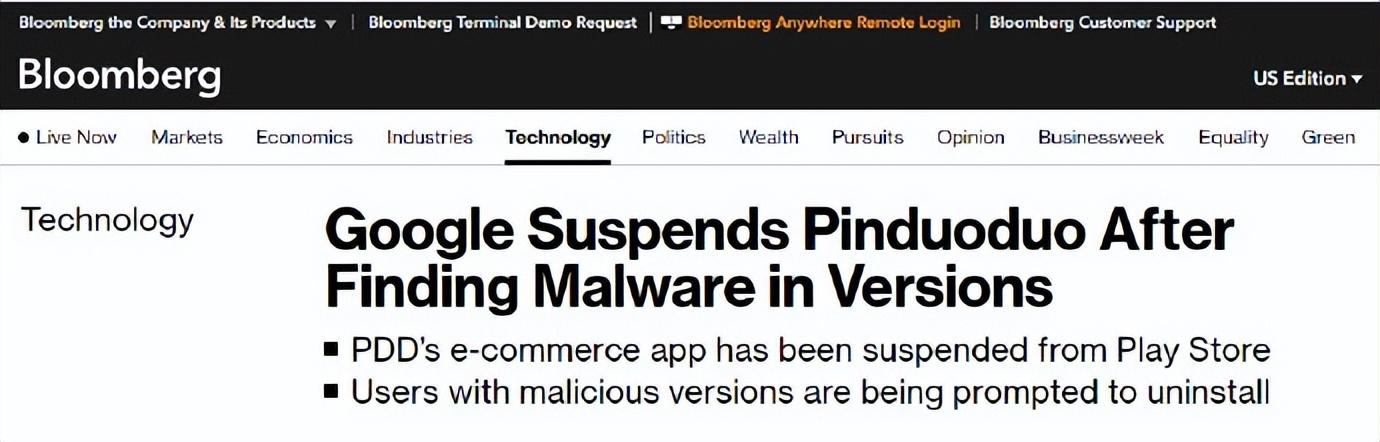 3月21日,环球时报援引彭博社报道,Google公司称,由于发现拼多多的多个版本中存在恶意软件问题,已经将这款APP从Google商店下架。