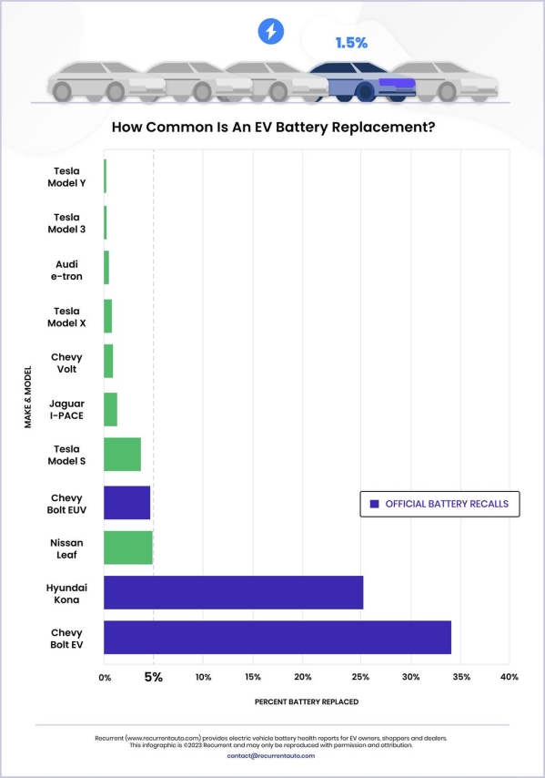Recurrent Auto调查了15000辆不同的电动汽车,该机构称,除了涉及更换电池的召回,其中只有1.5%的电动汽车更换了原装电池组。