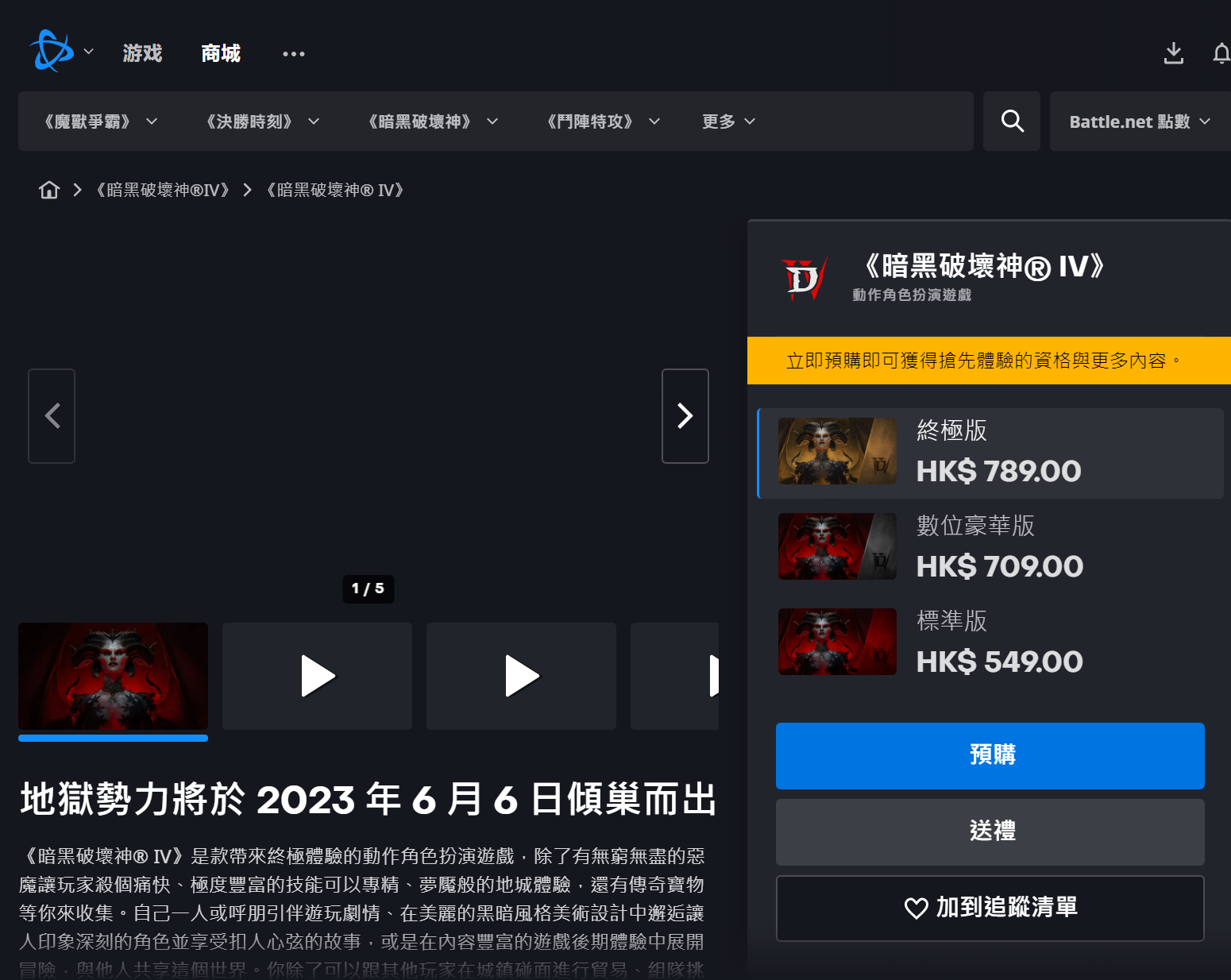此外,新的全球服还有个好处就是可以直接买暴雪未来的游戏,比如暗黑4,标准版起步价549港元,差不多500元人民币了,比第三方跨区购买当然贵一些,比原来的亚服价格也要高100左右,就看玩家的选择了。