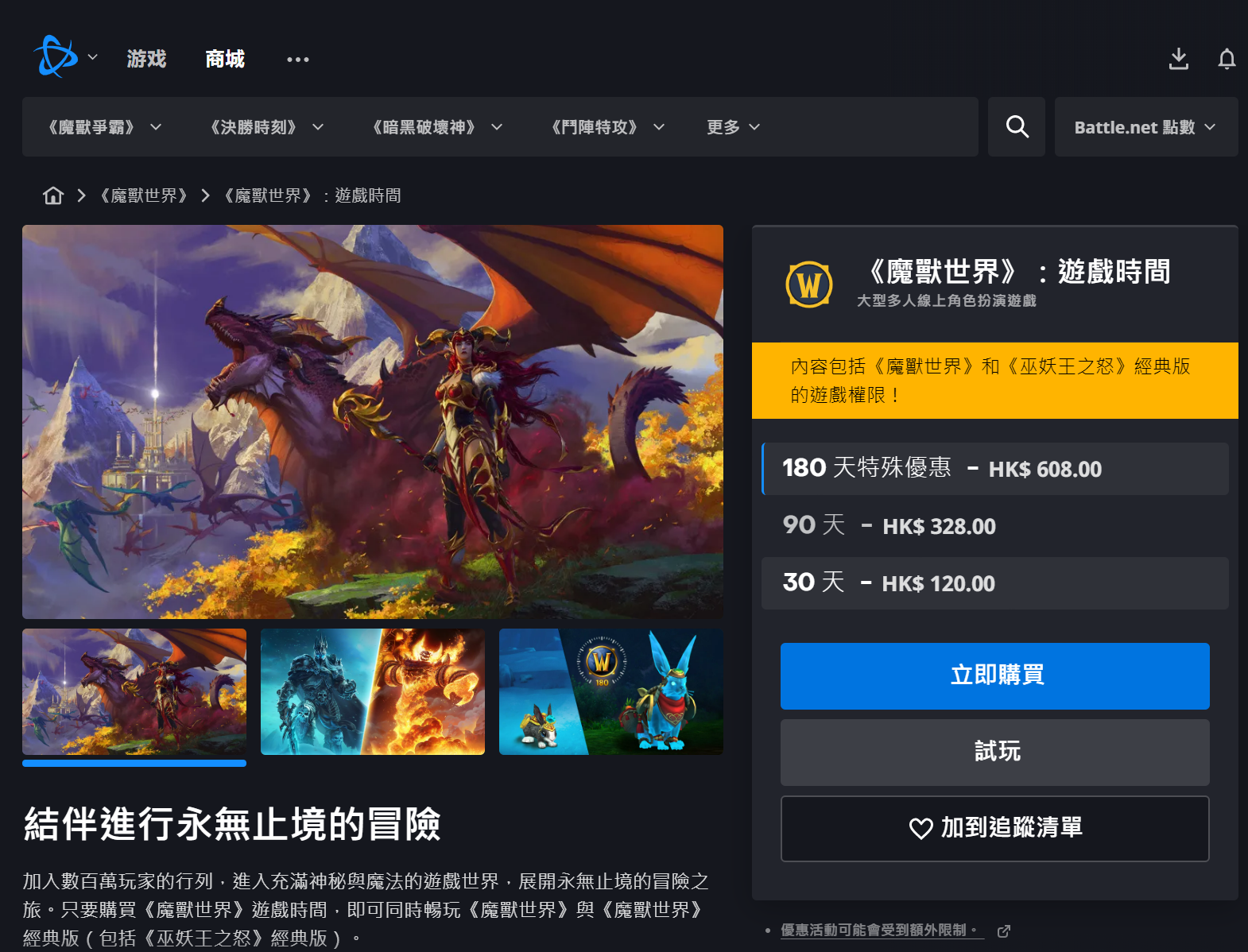 不过代价就是玩游戏的费用上涨不少,这个全球服是暴雪直营的,所以价格是看齐美区的,月卡要120港币,季卡要328港币,半年卡要608港币。