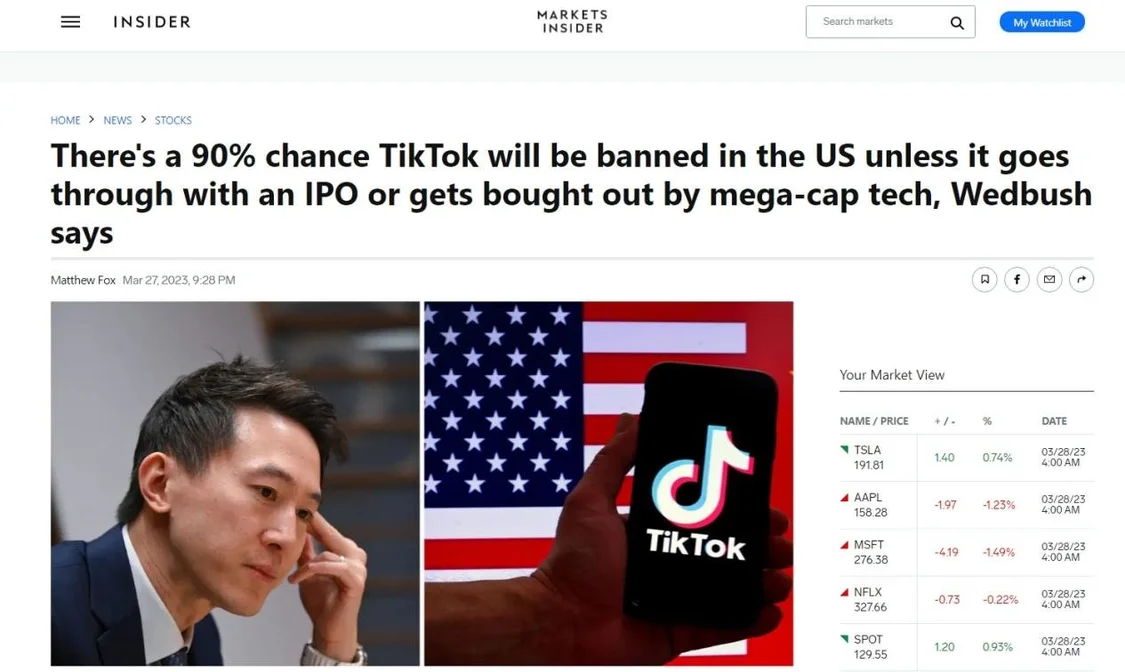 美国科技媒体《商业内幕》报道,WedBush称TikTok有9成概率会被封禁。