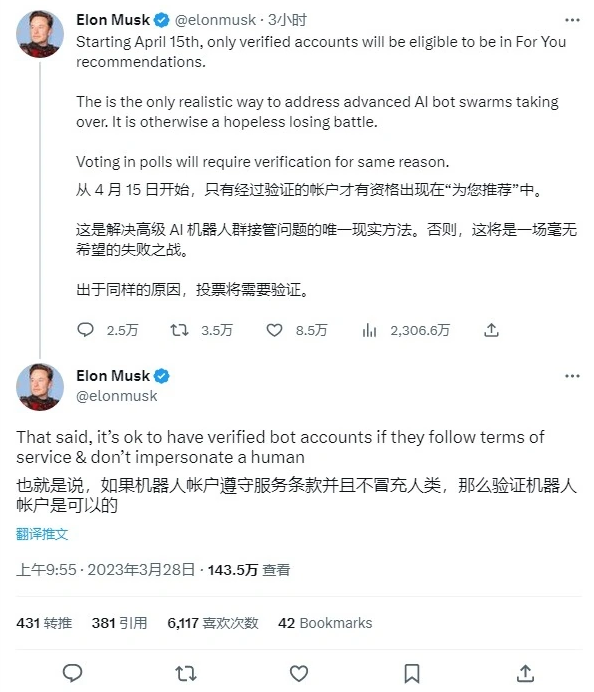 去年,马斯克在收购Twitter后,推出了Twitter Blue订阅服务作为平台新的盈利方向。今天,马斯克在自己的账号上发布内容,称“从4月15日起,只有经过认证的账号的内容才有资格出现在‘为您推荐’中”,此外,发起或参与投票也同样需要经过认证的账号。