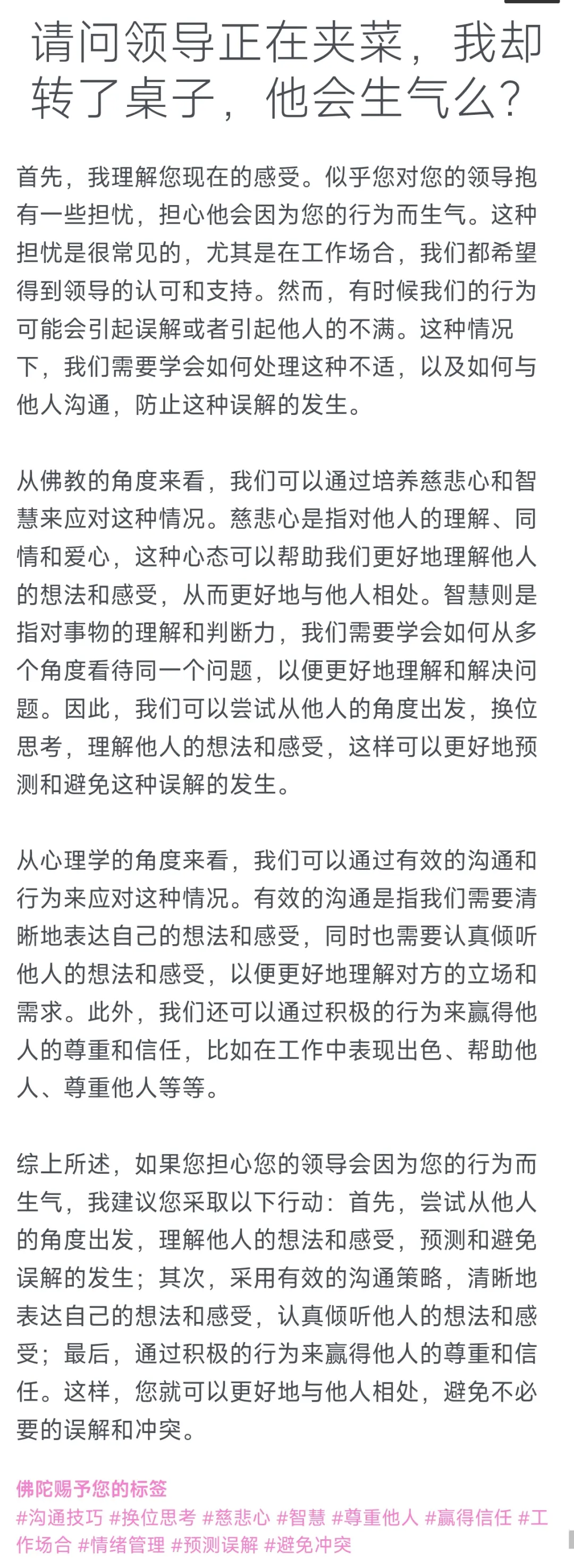 提问:请问领导正在夹菜,我却转了桌子,他会生气么?