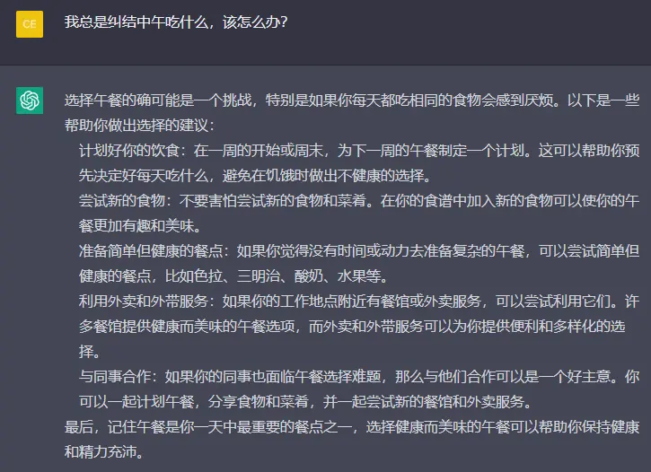 然后继续拉近关系,AI认为思考“中午吃什么”确实很烦人,尤其是需要在工作中去快速做决定,那种不确定性让人焦虑。