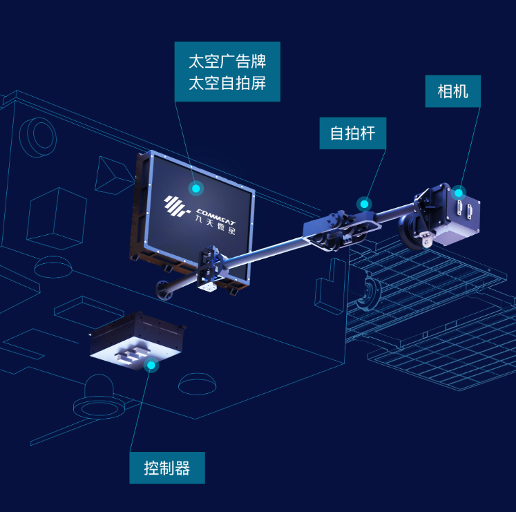 显示屏安装于卫星表面,自拍相机设置于显示屏后上方,卫星进入太空后,接收来自地面测控站发送的用户图像信息,显示屏将显示用户上传的图像画面,以地球或太空为背景拍摄全球独一无二的太空自拍照。