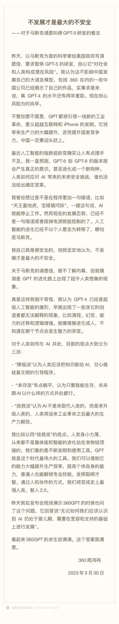 3月30日消息,周鸿祎发布微博,对马斯克请愿叫停GPT-5研发一事发表看法。“不发展才是最大的不安全”,周鸿祎表示,马斯克等人的请愿不影响中国发展自己的大语言模型,目前中国相关技术水平距离GPT-4还有两年差距,现在担心风险为时尚早。”