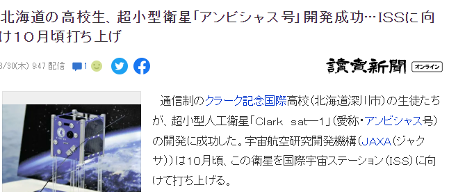 北海道克拉克国际高中日前宣布,学校的学生们开发成功超小型卫星Clarksat―1,已经获得日本航天研究机关认可,计划10月发射到国际空间站(ISS)。Clarksat―1是一个边长10厘米的立方体,重量仅为1公斤,其中有5个面安置了太阳能发电板,计划发射到ISS后,可以使用机器装置射到空间轨道,从而监控拍摄地球环境。