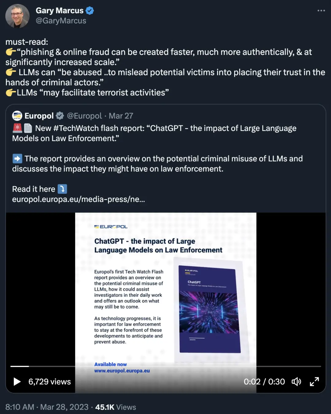 虽然人工智能社区经常关注长期风险,但我并不是唯一担心严重的、短期影响的人。欧洲刑警组织(Europol)发布了一份报告,考虑了一些犯罪的可能性,发人省醒。