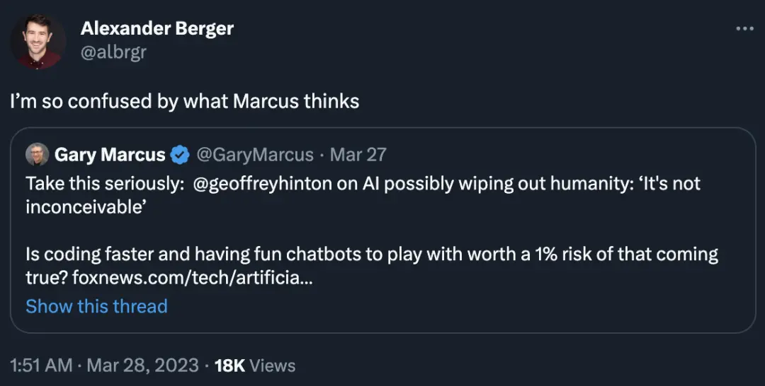 一位杰出的业内同行写信质问我:“这封公开信难道不会导致人们对即将到来的 AGI、超级智能等产生毫无道理的恐惧吗?” 一些人对我放大 Hinton 的担忧感到非常惊讶,以至于在Twitter上冒出了一整条猜测我自己信念的话题: