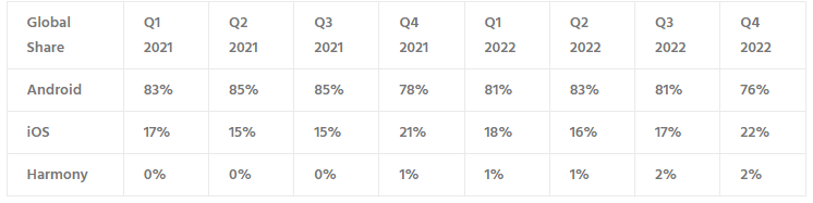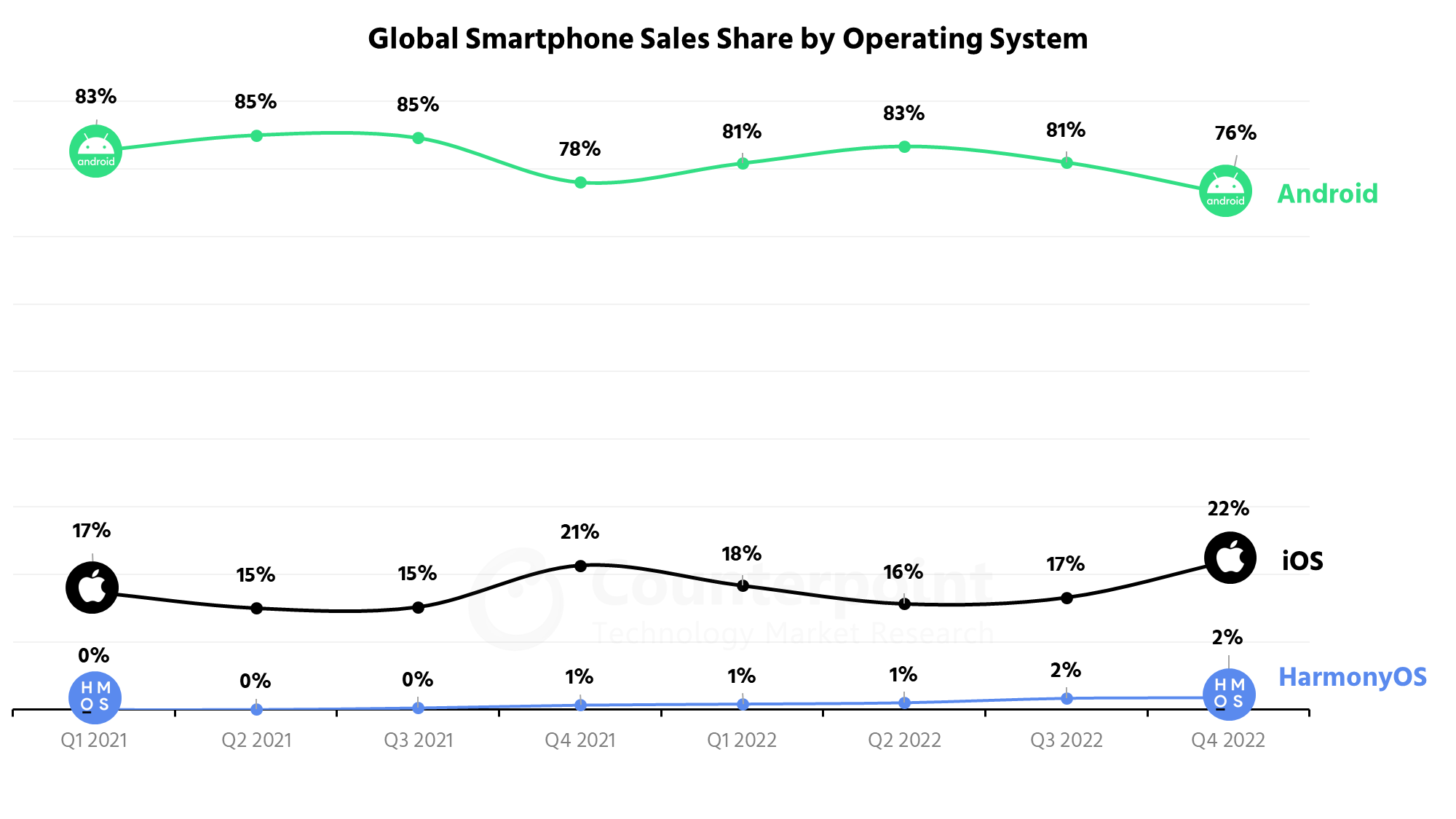 最新数据表明,在智能手机市场,鸿蒙已经坐稳第三大操作系统。调研机构Counterpoint Research的报告显示,去年四季度,鸿蒙OS全球份额2%,中国市场的份额更是来到8%。
