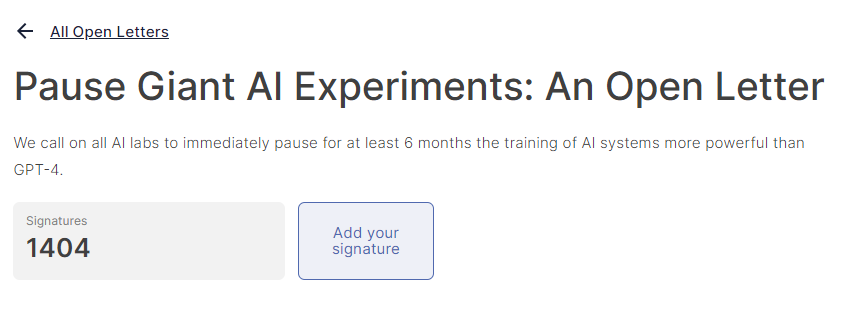 眼看 AI 起高楼、眼看它楼塌了?就在昨天早上,一封公开信刷屏了朋友圈,著名安全机构生命未来研究所( Future of Life Institute , FLI )呼吁全球所有研究机构暂停训练比 GPT-4 更强的 AI。至少六个月。并且要在这六个月中来制订和 AI 相关的安全协议,其中就包括如何监管 AI 输出的内容,还有如何把 AI 创造出的内容和真实的内容区分开来。