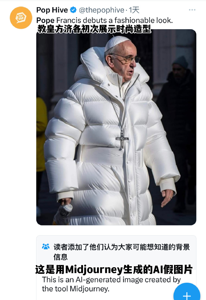 也更容易骗到大家的眼睛。前几天流行的 “ 川普被捕 ” 或者是 “ 教皇穿羽绒服 ” ,都是出于 Midjourney 的手笔。