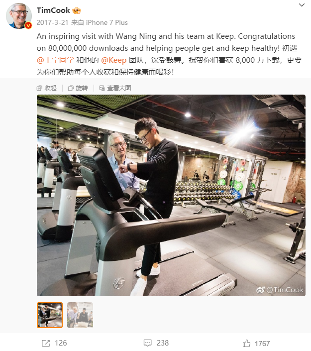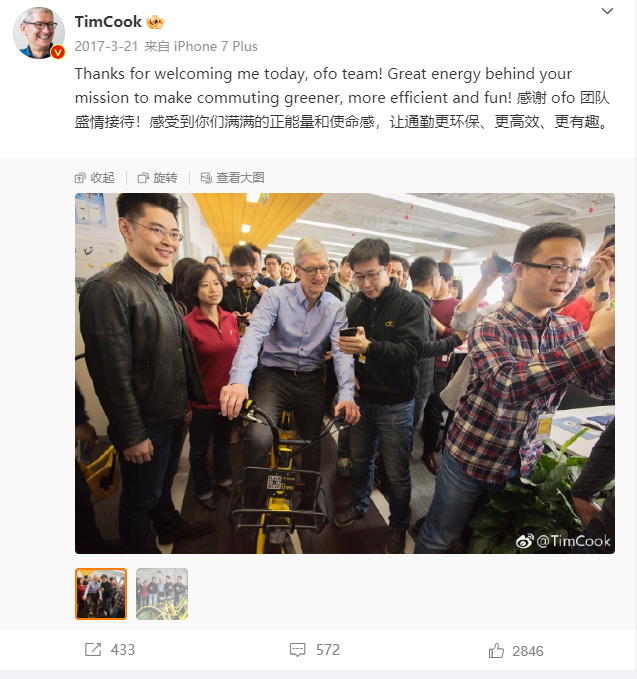 彼时,库克发文称,“感谢ofo团队盛情接待!感受到你们满满的正能量和使命感,让通勤更环保、更高效、更有趣。”