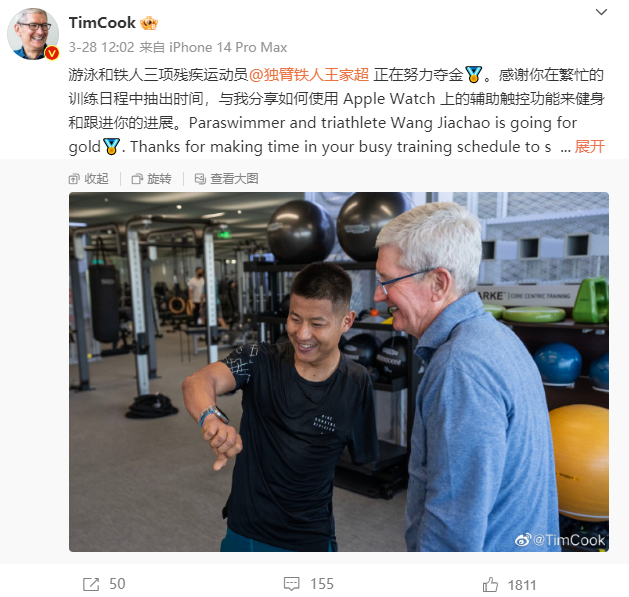 3月24日,苹果公司CEO蒂姆·库克开启了自己2023年中国行,在北京待了几天后,又前往上海参加活动。据了解,此次库克是受邀来参加中国发展高层论坛,这一周时间,库克除商务会谈等必要工作外,还见到了Apple华贸购物中心零售店团队;去了游泳和铁人三项残疾运动员王家超的训练基地等。