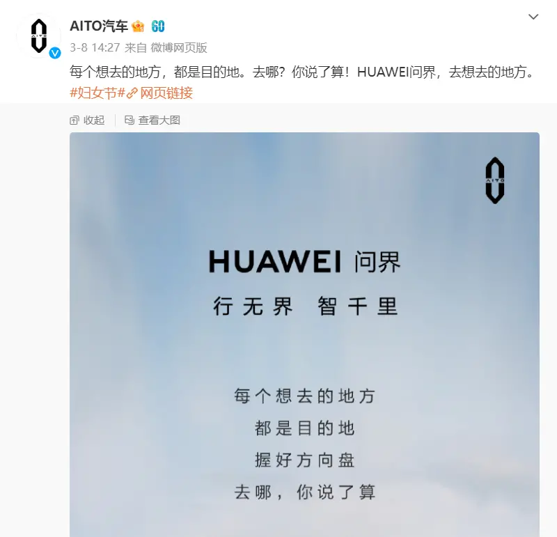 值得注意的是,今年2月,AITO官博发布的海报中,曾一度将logo从AITO换成HUAWEI,对外宣传话术也从“华为深度赋能”改为“华为全面主导”。