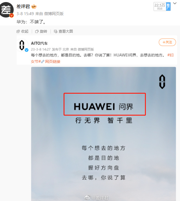 简直是明牌针对,问界在 3 月 8 号把宣传语中,由原先 “AITO 问界 ” 的字样更改为了 “HUAWEI 问界 ” 一事了。。。