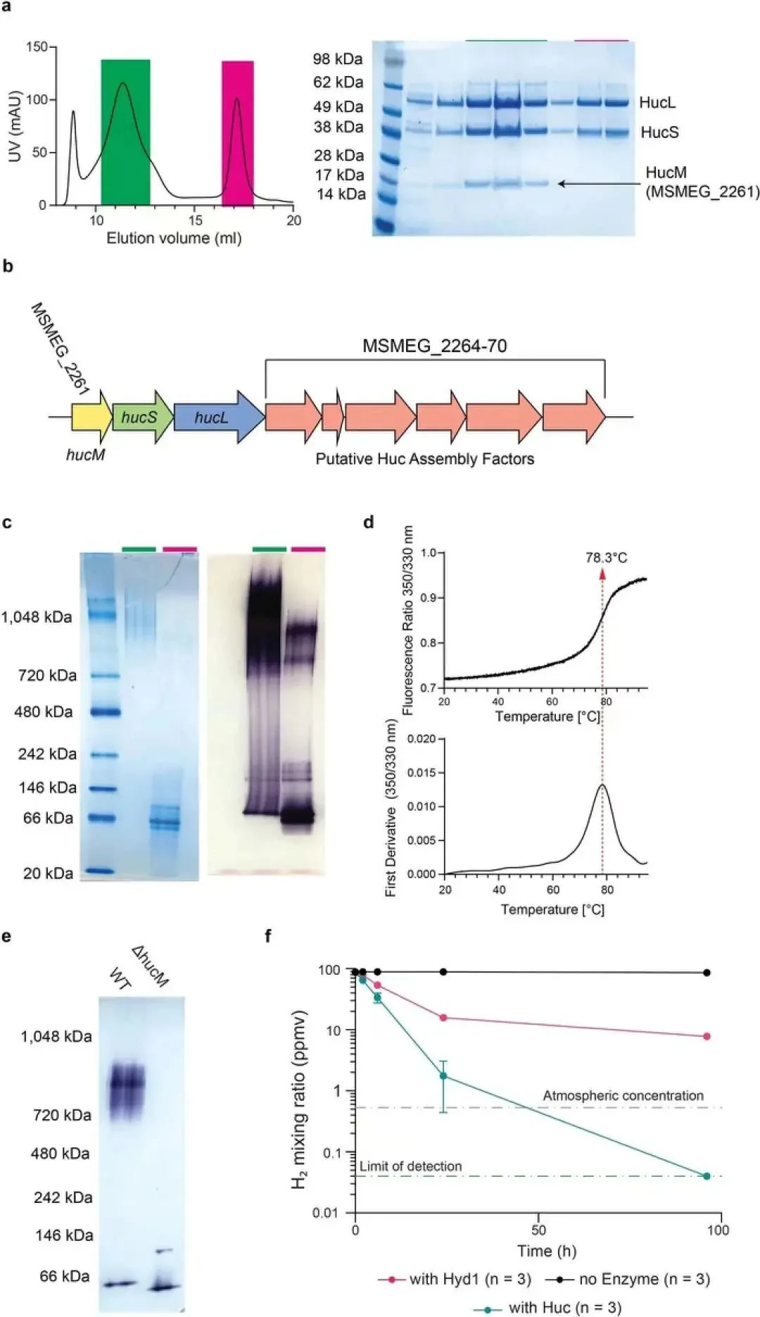 使用HucS亚基上的染色体编码的Strep-tag II从耻垢分枝杆菌中分离出 Huc,通过SDS-PAGE表明,Huc 由对应于 HucL(约58 kDa)、HucS–2×Strep(约 39 kDa)和第三个未知亚基(约 18 kDa)的三个蛋白质亚基组成。