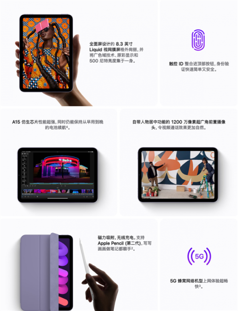 至于配置方面,翻新版iPad mini 6完全一新版一致,搭载强劲的A15处理器,台积电5nm打造,CPU、GPU分别号称对比竞品性能领先50%、30%,可放置nano SIM卡。