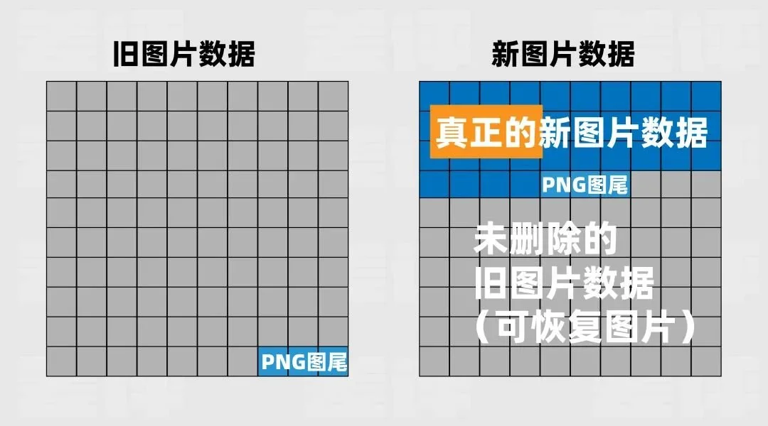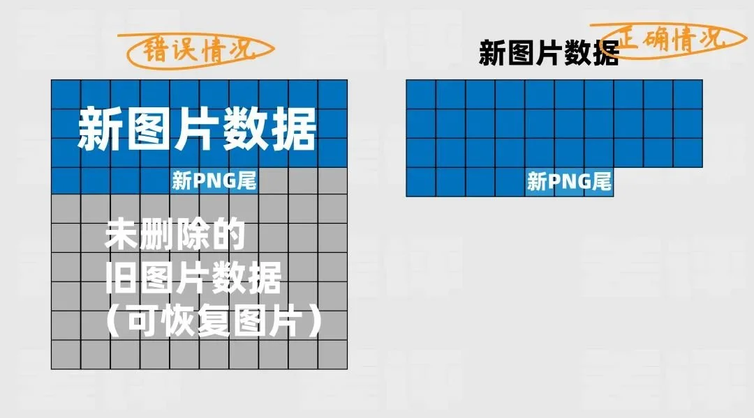 所以只要新的图片文件大小小于旧文件,没完全用数据把原图覆盖掉,就留下了可恢复的旧图像数据。