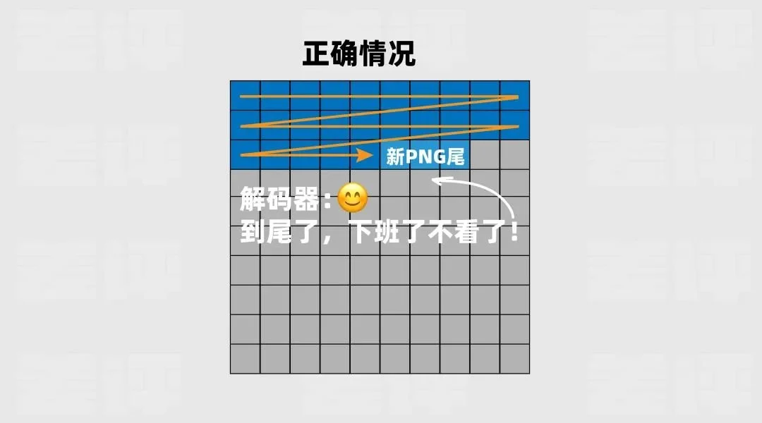 而标准的 PNG 解码器,在读到新 PNG 文件尾的时候,就不会再读下去了,所以剩余的旧数据,会被解码器直接忽略。