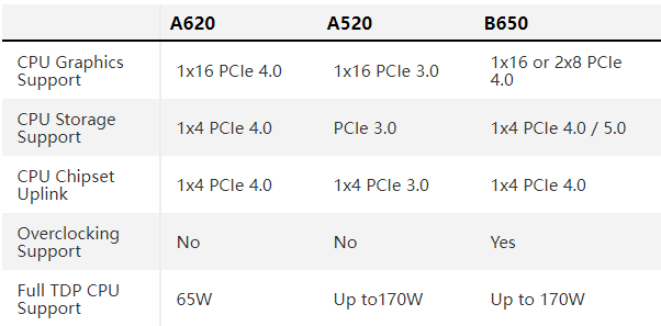 在连接方面,A620仅支持两个USB 10Gbps和两个5Gbps端口,B650是一个USB 20Gbps和六个10Gbps。另外,砍掉了PCIe 5.0,但保留了PCIe 4.0显卡和NVMe SSD直连CPU,相较于A520,也允许1个M.2和4个SATA3。