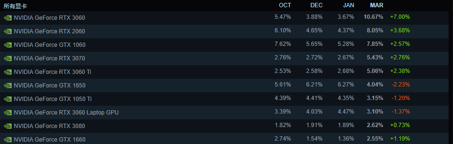 在三月,RTX 3060显卡异军突起,以10.67%的占有率登上榜首,RTX 2060和GTX 1060分居二、三名。
