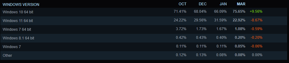 至于系统,目前用户数最多的依旧是Win10,且出现了高达9.56%的涨幅,反倒是在二月涨势明显的Win11,在三月出现了8.67%的明显下跌。