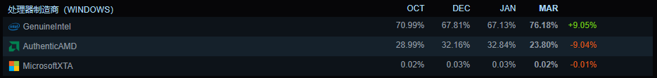 处理器方面,Intel占比提升9.05%,来到76.18%,保持了其在这方面的绝对优势。