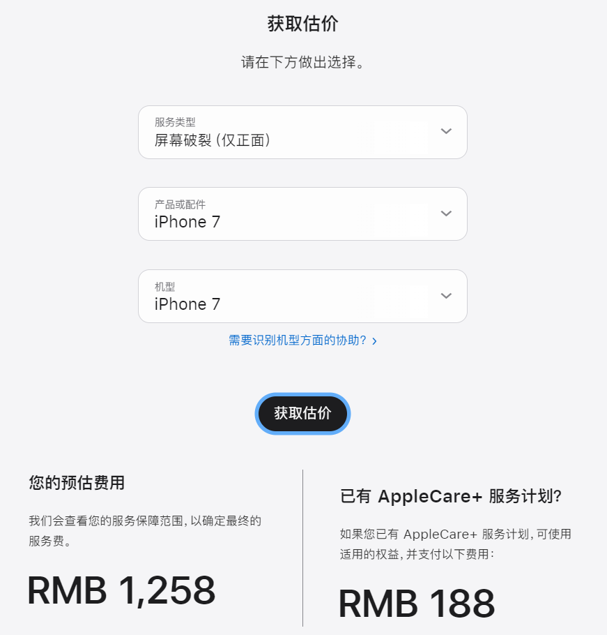 如果你没买 AppleCare+,那么给 iPhone 7 换屏幕 1258;给 2017 款 iPad 换电池 799,给 2017 款 MacBook Pro 换屏幕或者外壳官网则没给估价: