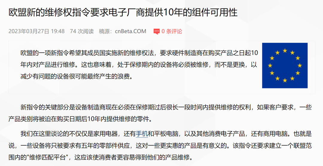 不过话又说回来,除了要求厂商延长产品的维修期限外,欧盟的这套法案其实还提出了一些鼓励旧设备再利用的措施,其中几条还挺有可取之处。