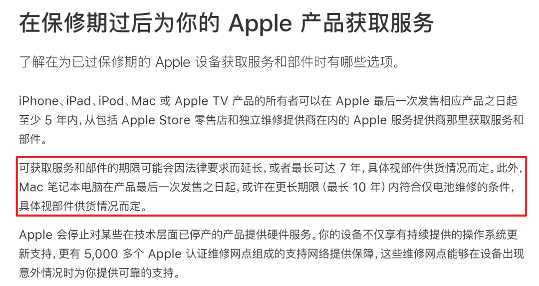有一说一,果子对于旧设备还是挺友好的,iPhoneiPad 或者 Mac 可以在苹果最后一次发售相应产品之日起至少 5 年内从服务提供商那获得维修服务。
