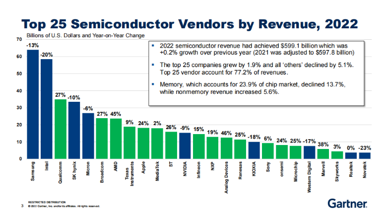 市调机构Gartner近日发布的报告展示了全球以及中国大陆前25名半导体厂商的排名情况,其中三星、Intel和高通依然位列前三。数据显示,2022年全球半导体收入达到5991亿美元,仅同比微幅增长0.2%,排名前25半导体厂商总收入同比增长1.9%,“其它”公司总收入则下降5.1%。