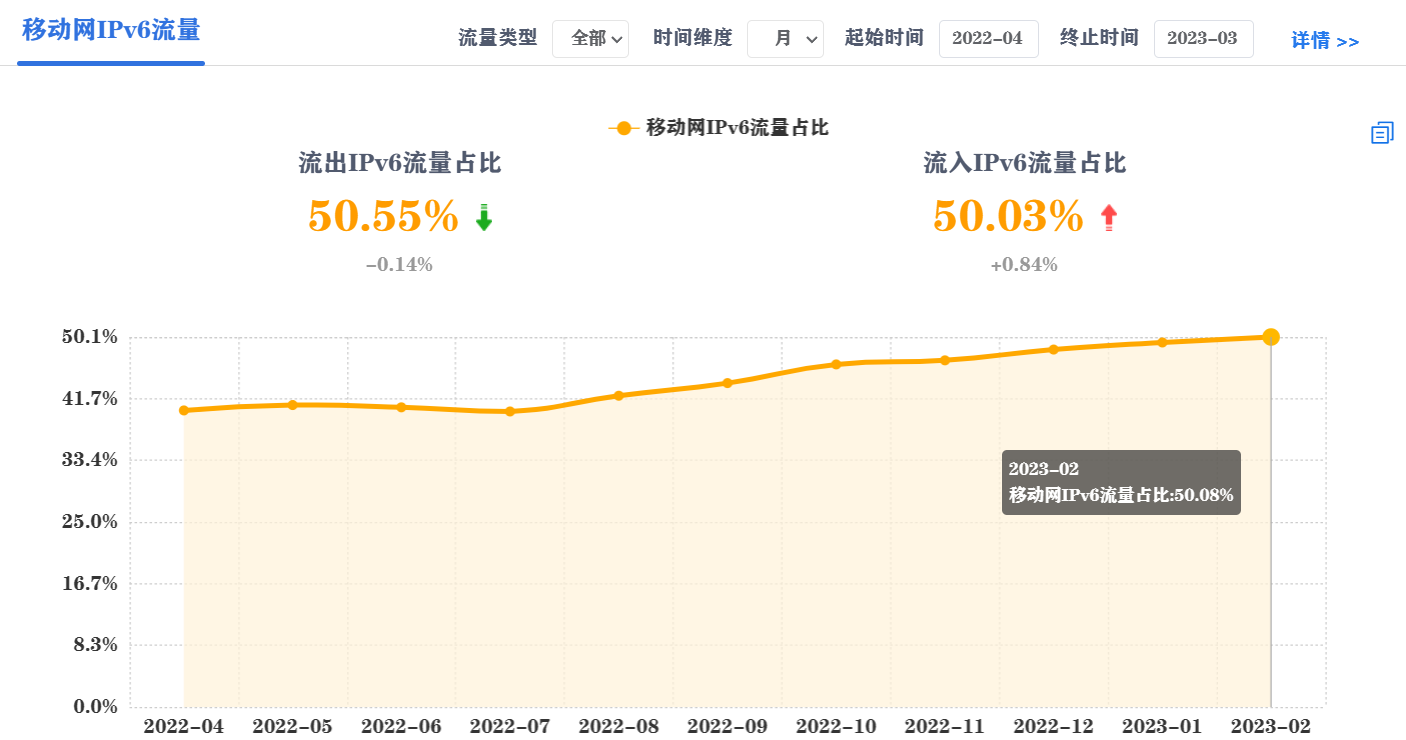 近日,据国家IPv6发展监测平台统计数据,截止2023年2月,国内移动网络IPv6占比终于突破50%大关,达到了50.08%。同时,这也是IPv6流量首次实现超过IPv4的历史性突破,标志着我国推进IPv6规模部署及应用工作迎来了新的里程碑。