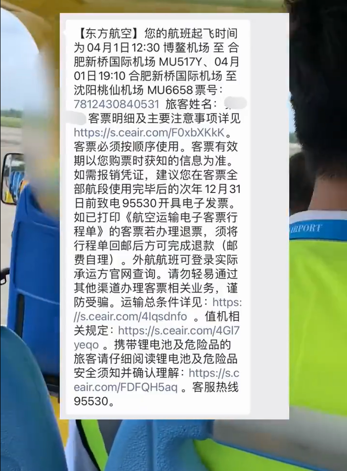 当事人秦女士介绍称,自己计划3月31日下午从海南博鳌出发,要坐飞机去合肥,但在30号当天收到了短信称由于天气原因,航班被取消了,女子本打算改签,但没想到又收到了一条短信,称4月1日中午起飞。
