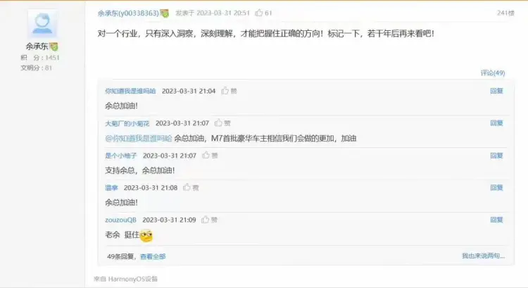 当天夜间,余承东下达指令:问界门店将于4月1日开始拆除所有相关华为字样的宣传物料。随后,网络传出余承东就不造车,华为Logo滥用一事,在华为内网上的留言回应,“对一个行业,只有深入理解才能把握住正确方向!标记一下,若干年再来看吧!”