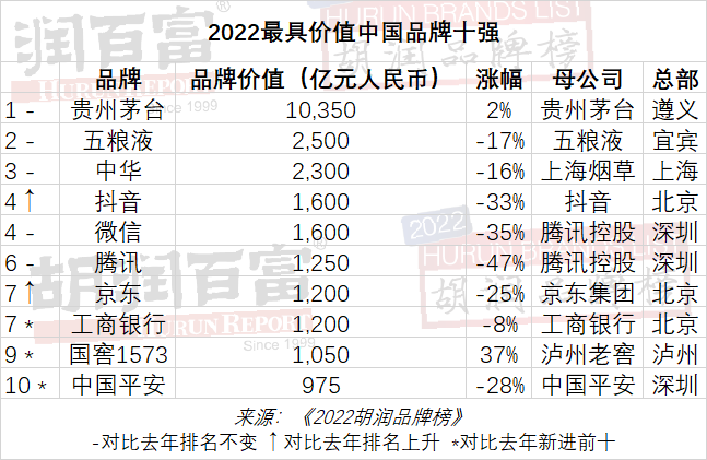 2022胡润品牌榜发布:200强扩大至300强 贵州茅台高居榜首
