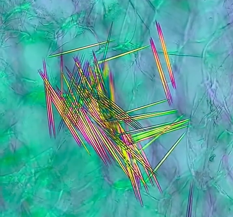 实际上这些针,就是草酸钙(raphides),它是一种白色结晶状的粉末,进入口腔后,会刺破我们的口腔黏膜、舌头、咽喉等组织,造成损伤,产生扎嘴的感受。