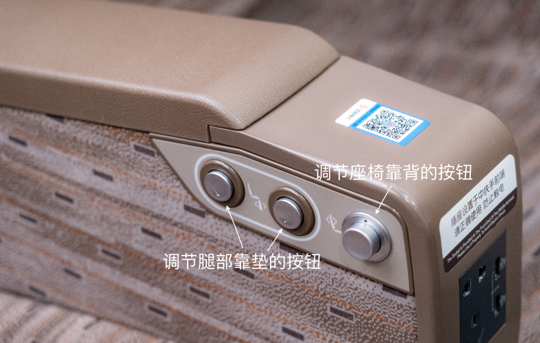 此外,复兴号智能动车组的一等座,加装的可调节的腿部靠垫,是提高乘坐舒适度的又一“神器”(调节按钮在扶手侧面),旅客可根据自身需求调整座椅靠背和腿部靠垫角度,搭配椅背上可调节的靠枕,便可按照自身习惯的睡姿在旅途中享受更加安稳的睡眠。