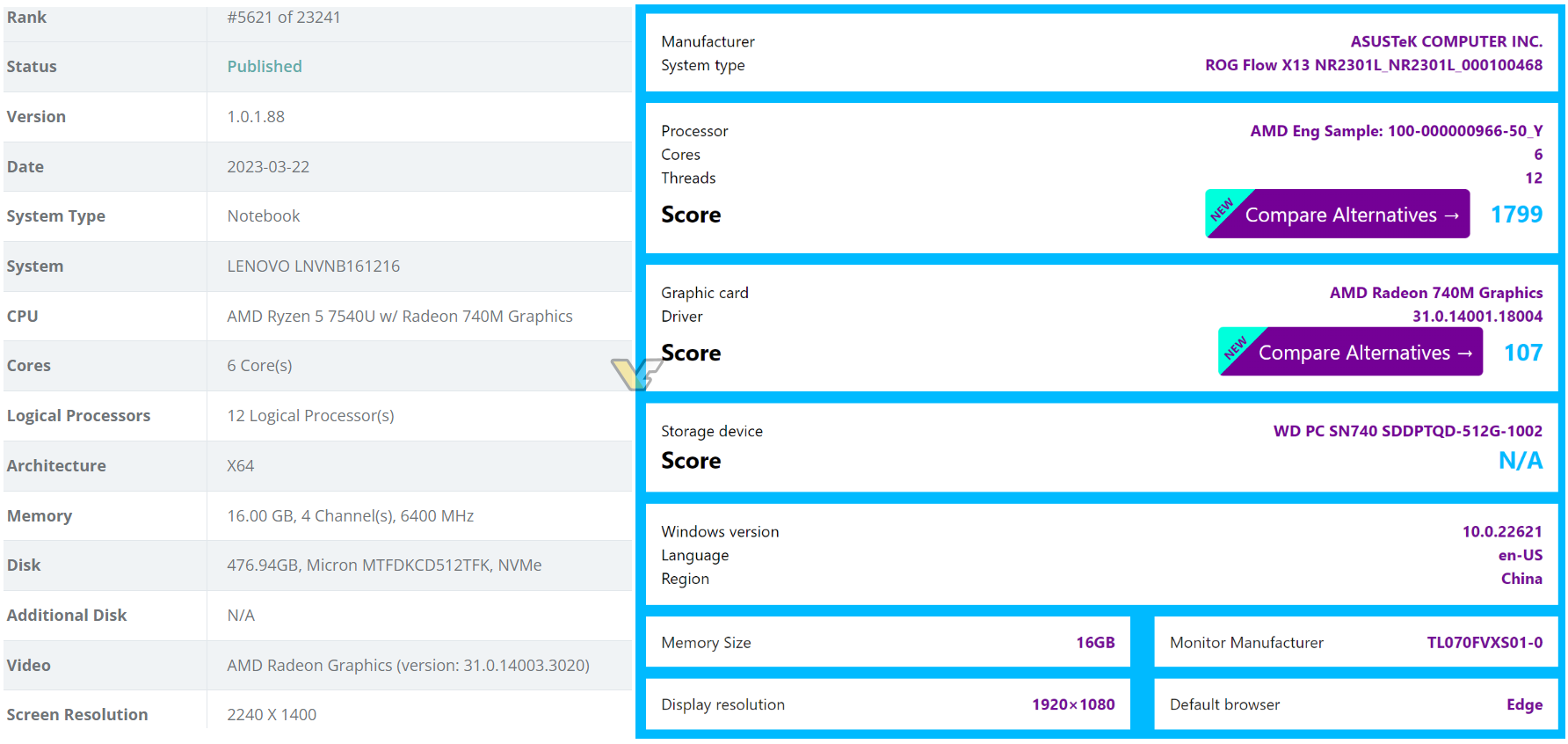 联想LNVNB161216、华硕ROG Flow X13都采用了这颗处理器,其中后者在一个多月前就测试了,所以型号部分显示AMD工程样品。