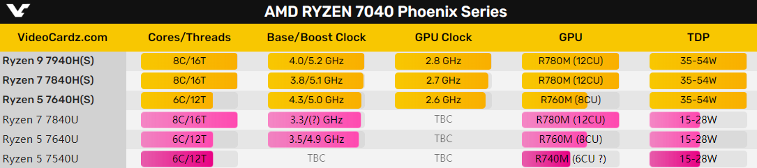 锐龙7040U系列则降到了15-28W,其中锐龙5 7540U只有6核心12线程,主频不详,核显部分叫做Radeon 740M,从未见过的命名,猜测会在Radeon 780M/760M的基础上继续精简,大概率只有4个CU单元。