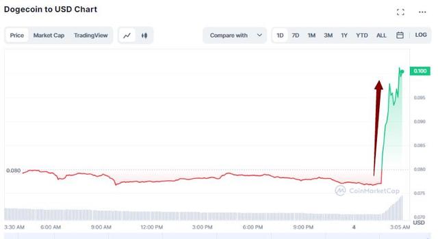 狗狗币(DOGE)周一美股午盘时段大涨,一度从0.077美元涨至0.102美元,创去年12月以来盘中新高,盘中涨幅曾达到30%,后涨幅略有收窄,到美股收盘时,最近24小时涨幅超过23%。
