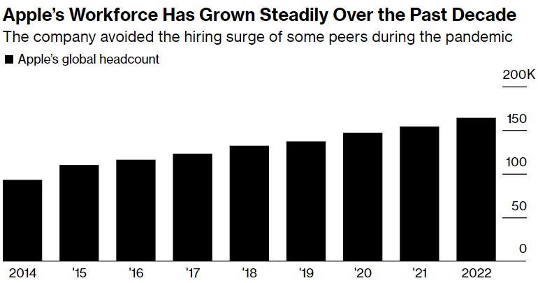 苹果在11月暂停了研发以外的大多数职位的招聘,今年3月,苹果扩大了招聘冻结的范围。对于许多团队来说,苹果已经停止了招聘,当员工离开时,职位不会再空出。放缓招聘使苹果得以避免其他科技公司近几个月来宣布的大范围裁员。