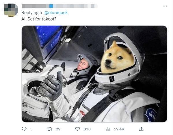 有网友将马斯克和“狗头”P进载人飞船,并配文称,“一切就绪,准备起飞!”