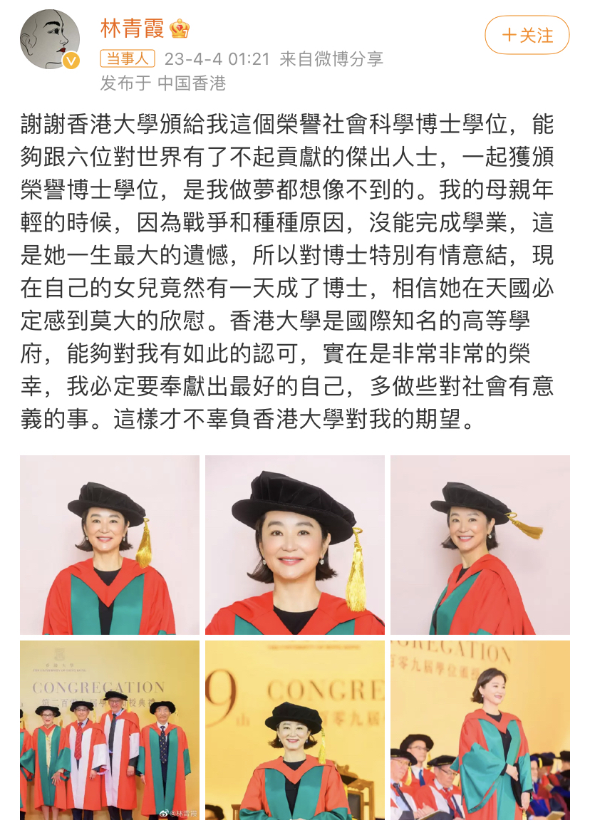 4月4日凌晨,68岁的林青霞晒获颁香港大学荣誉社会科学博士学位的现场照,并发文称,这是她做梦都想不到的,她表示母亲最大的遗憾是没能完成学业,如今她成了博士,相信母亲在天国必定感到欣慰,“我必定要奉献出最好的自己,多做些对社会有意义的事。这样才不会辜负香港大学对我的期望”。