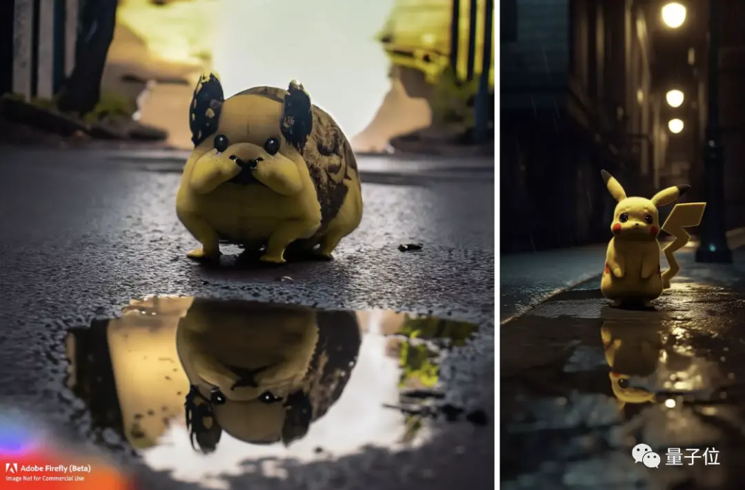 除去皮卡丘形象不说,还是MidJourney更能抓住氛围,Firefly这次连昏暗的街道都表现得不到位。