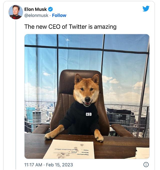 原本的蓝鸟标识变成了柴犬Dogecoin是在2013年以玩笑性质创建的,目的是嘲弄比特币等其他加密货币。去年秋天,特斯拉创始人马斯克(Elon Musk)以440亿美元收购了推特,同时,他也是Doge这个表情包的知名超级粉丝。今年2月,他甚至发布一条推文称:“推特的新首席执行官棒极了。”附图是一只柴犬坐在办公桌前的画面。