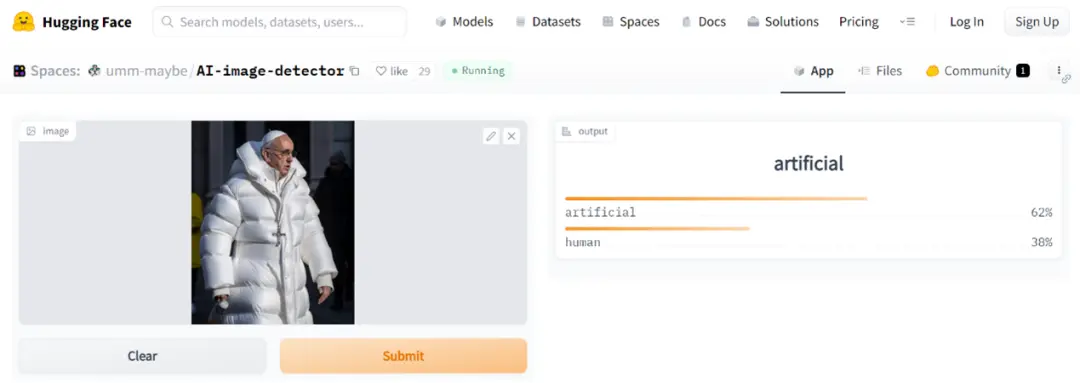 用Hugging Face的AI图像检测器检测“巴黎世家教皇”图像,反馈此图有62%的概率由机器生成。