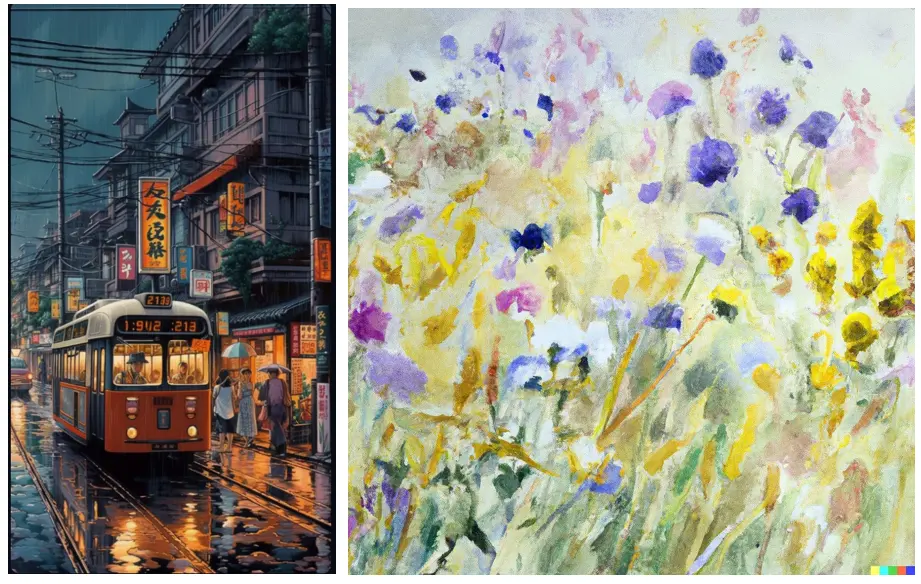 左图来自Midjourney图例; 右图由OpenAI根据“野花,草地,秋韵,水彩”描述进行创作。注意右下角的5个色块,这是DALL-E 2制图的标志(水印)。